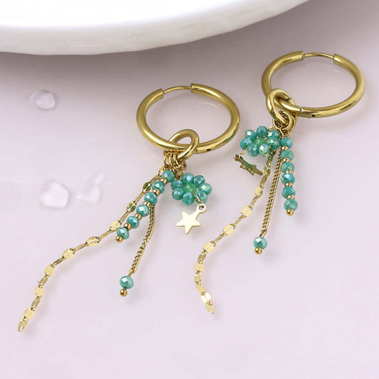 POM925 - Waterproof gold plated hoop earring with chain and bead clusters