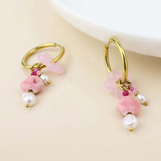 POM925 - Waterproof gold plated hoop and pink cluster earrings
