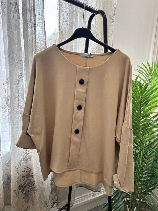 Lazy Jacks Ladies Striped Button Neck Sweatshirt - Khaki