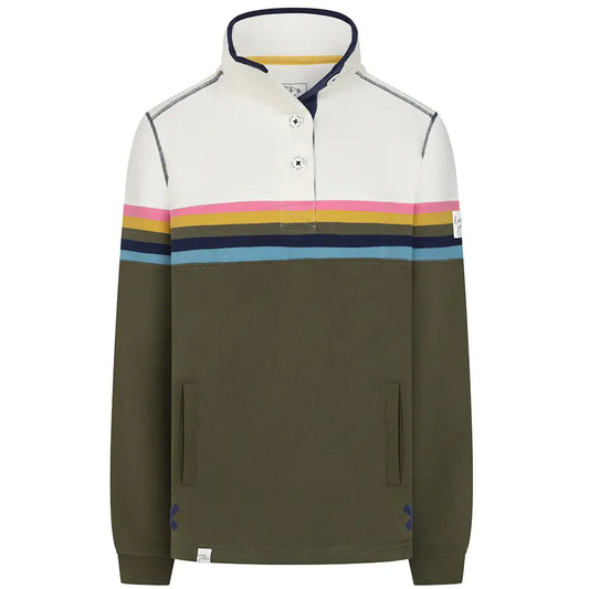 Lazy Jacks Ladies Striped Button Neck Sweatshirt - Khaki