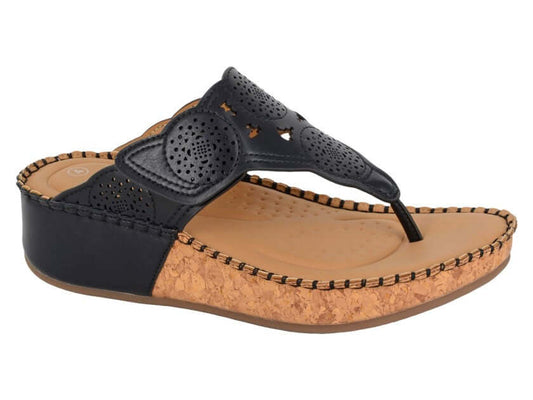 Corina - Black Touch Fastening Toe Post Wedge Sandal