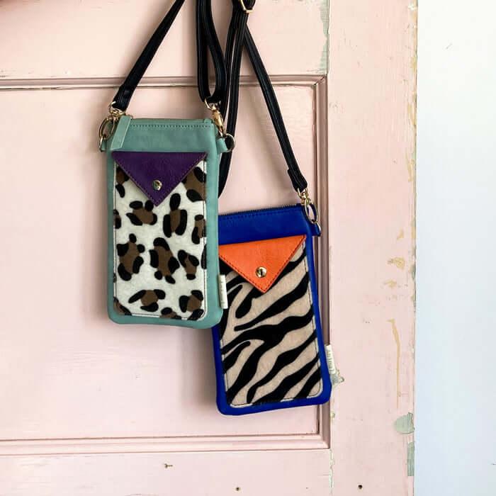 Materials: Features: An adorable Cross body bag for all your essentials including a Snow Leopard fur front pocket with a Purple poppered pocket lid . It includes a Gold & Mint Green zip on the main body of the Bag. Also includes a long Black detachable body strap which can be adjusted with Gold fixtures