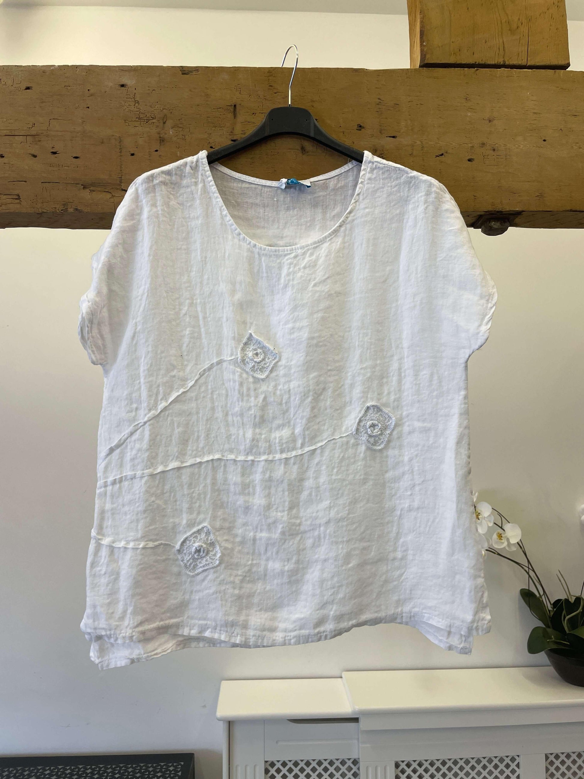 This Crochet Flower Linen T-Shirt is the perfect way to add some much-needed fun to your wardrobe. Featuring a stunning crochet floral detail, and the classic t-shirt shape, you can style it solo or layer it up for a summery lagenlook. Get blooming ready!