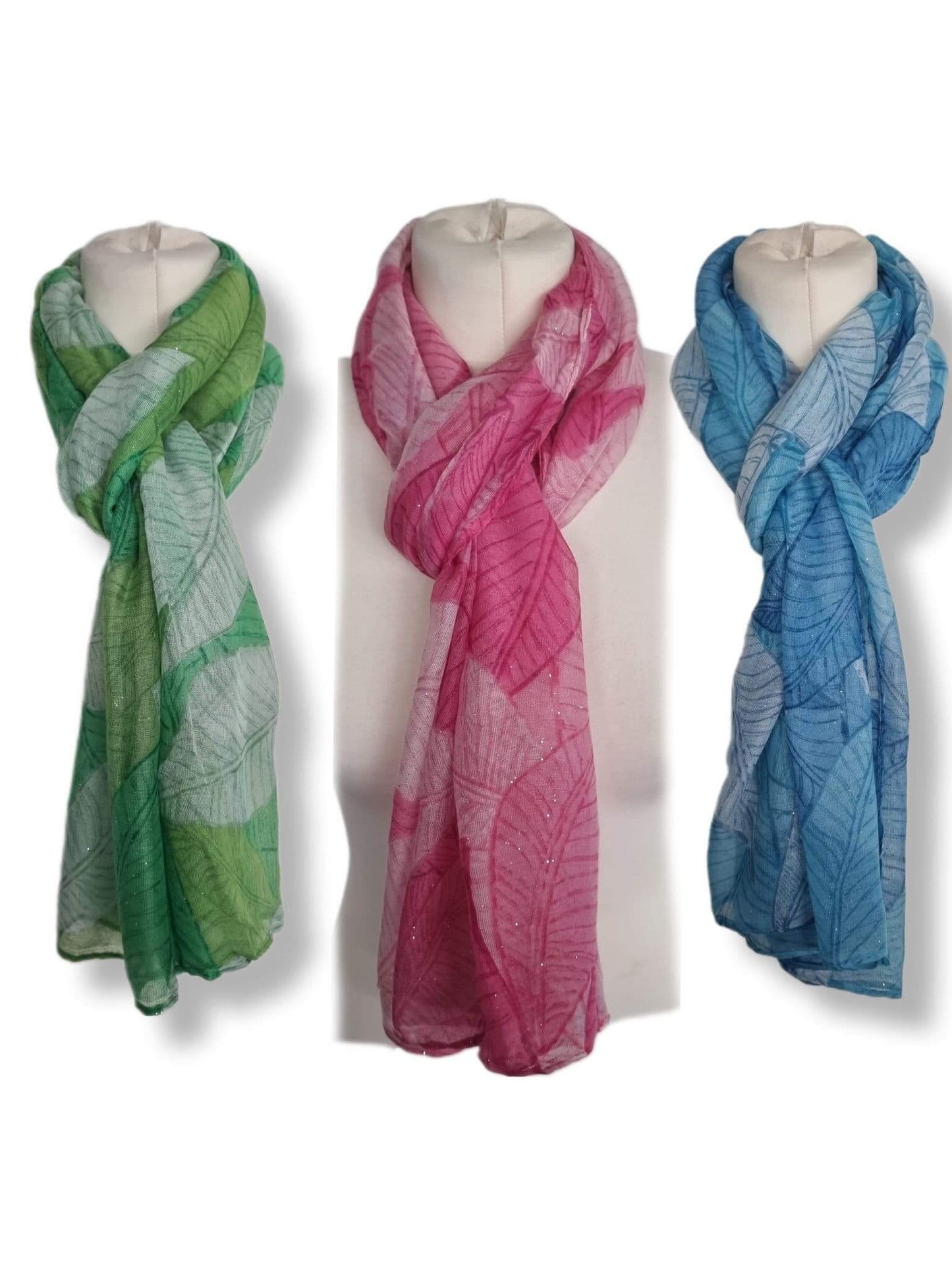 Drape yourself in luxury with our Glitter Leaf Print Lightweight Scarf. Available in Pink, Blue, and Green, this scarf features a shimmering leaf print that will elevate any outfit. Perfect for any occasion, add a touch of elegance to your wardrobe with this must-have accessory.
