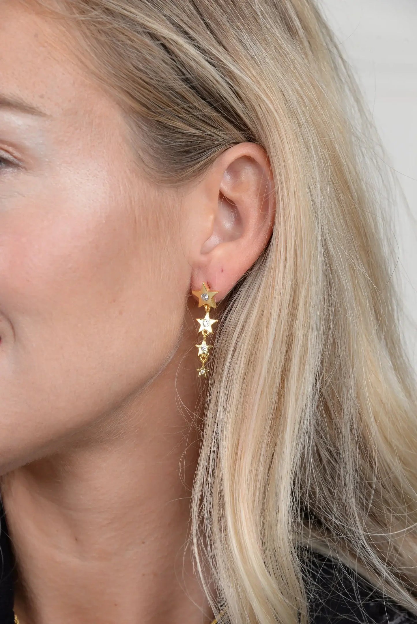 These elegant drop earrings feature a contemporary star shape, dazzling CZ stones, and a shiny gold finish.
