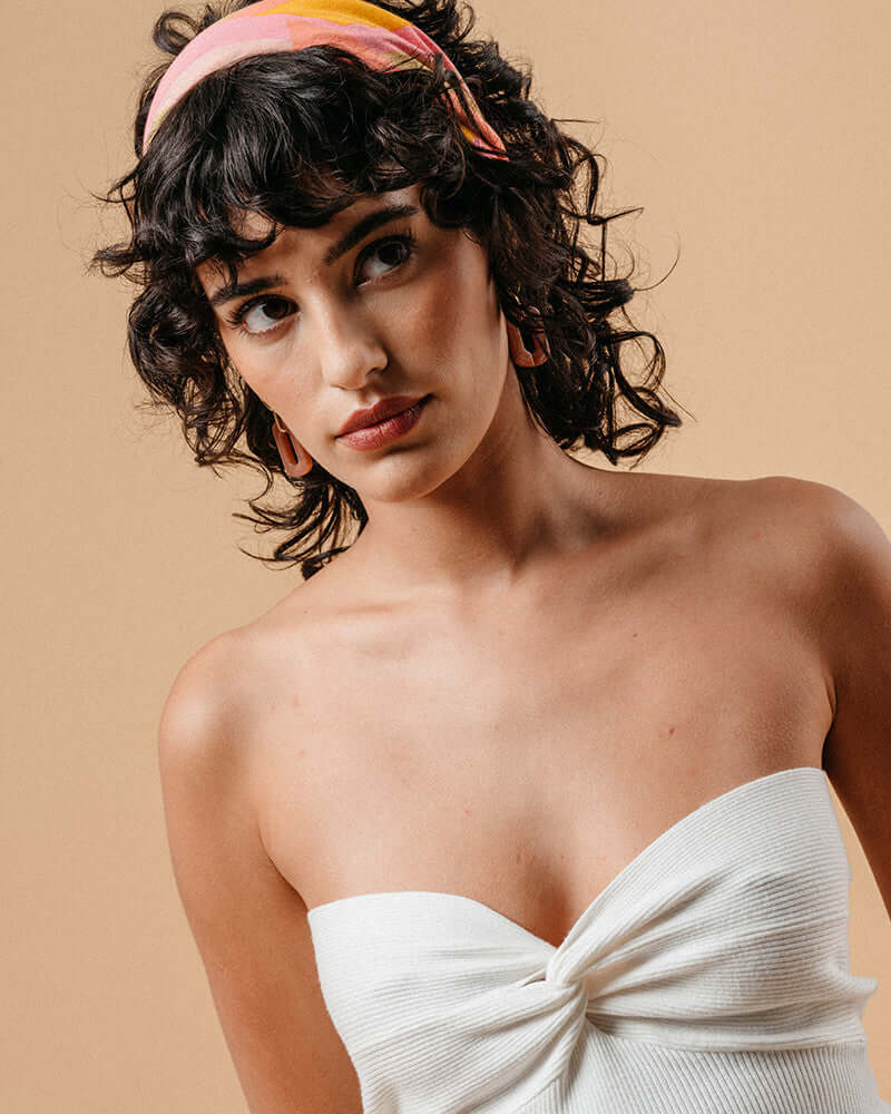 How to wear a bandeau top? At Grace & Mila, the MACARONI strapless top is styled with high-waisted pants and heels for a structured, feminine and elegant silhouette. We also like to wear it with the MEGANE bomber to cover shoulders when temperatures drop. Don't hesitate to accessorize with a Grace & Mila necklace to highlight your décolleté.