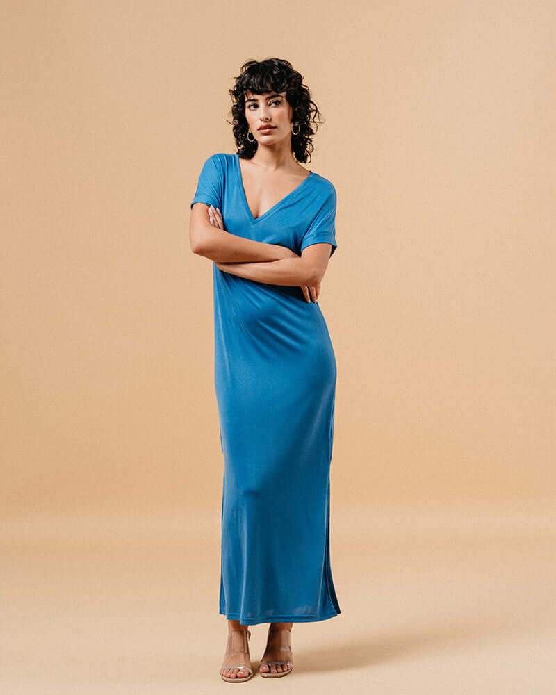 The silhouette: MARGAUX is the casual dress to have in your dressing room. Its light and fluid fabric that will leave room for each of your movements and that will gently marry your curves. We love its slits on the side and its V-neck that adds a touch of glamour and femininity. The long dress MARGAUX joins our range in natural fibers ""Un brin de vert"".