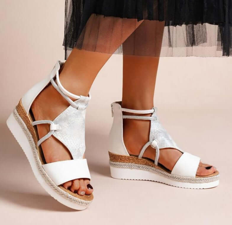 Step out in style with these playful wedge sandals featuring a subtle shimmer silver snakeskin detail. Perfect for adding a touch of sparkle to any outfit, their comfortable wedge heel keeps you dancing all day and night. Elevate your look with a fun twist on classic summer footwear!