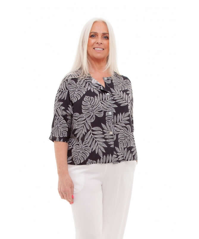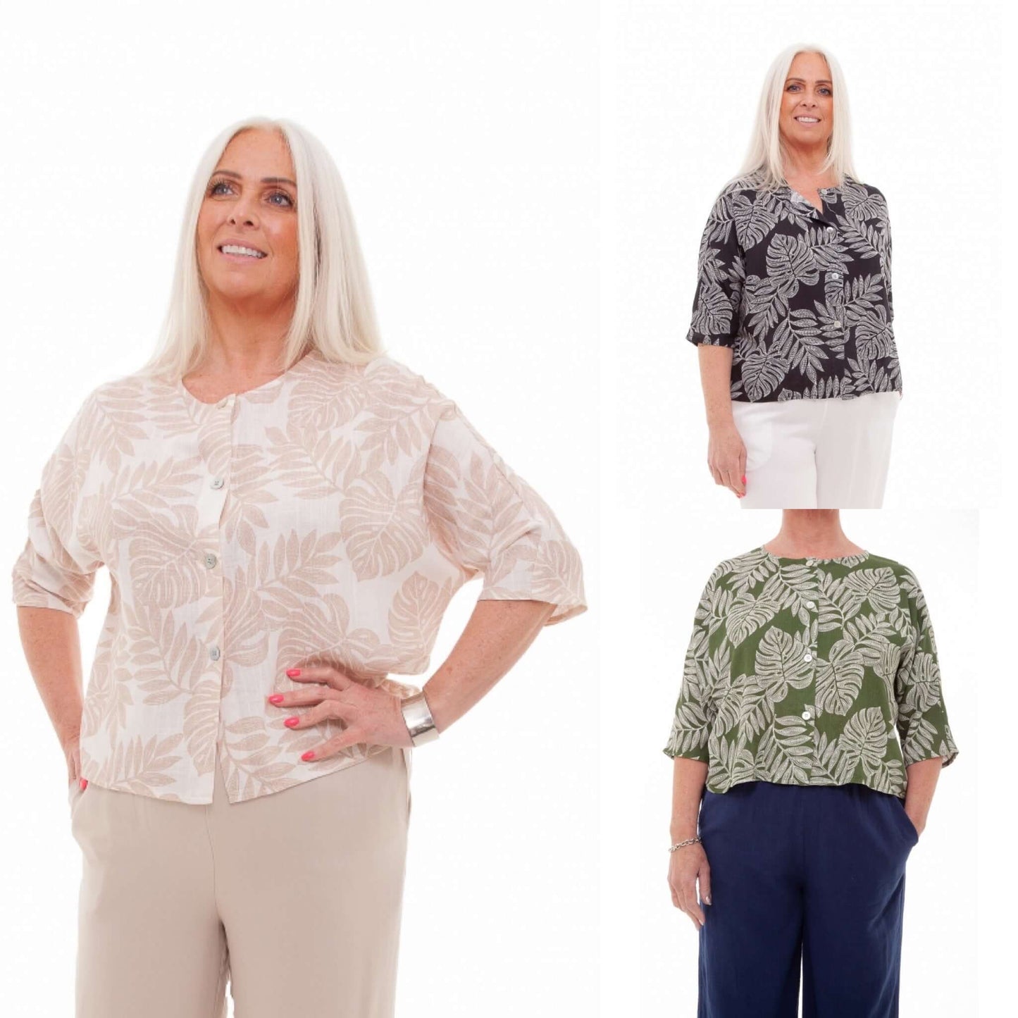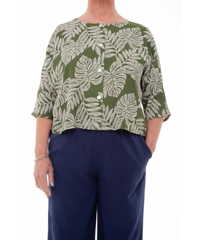 Linen Dotty Leaf Print Cropped Dolman Jacket