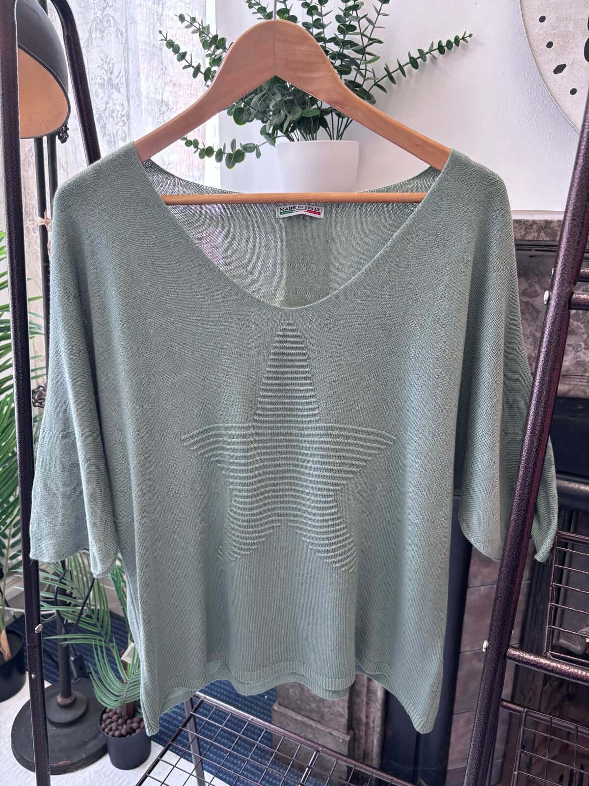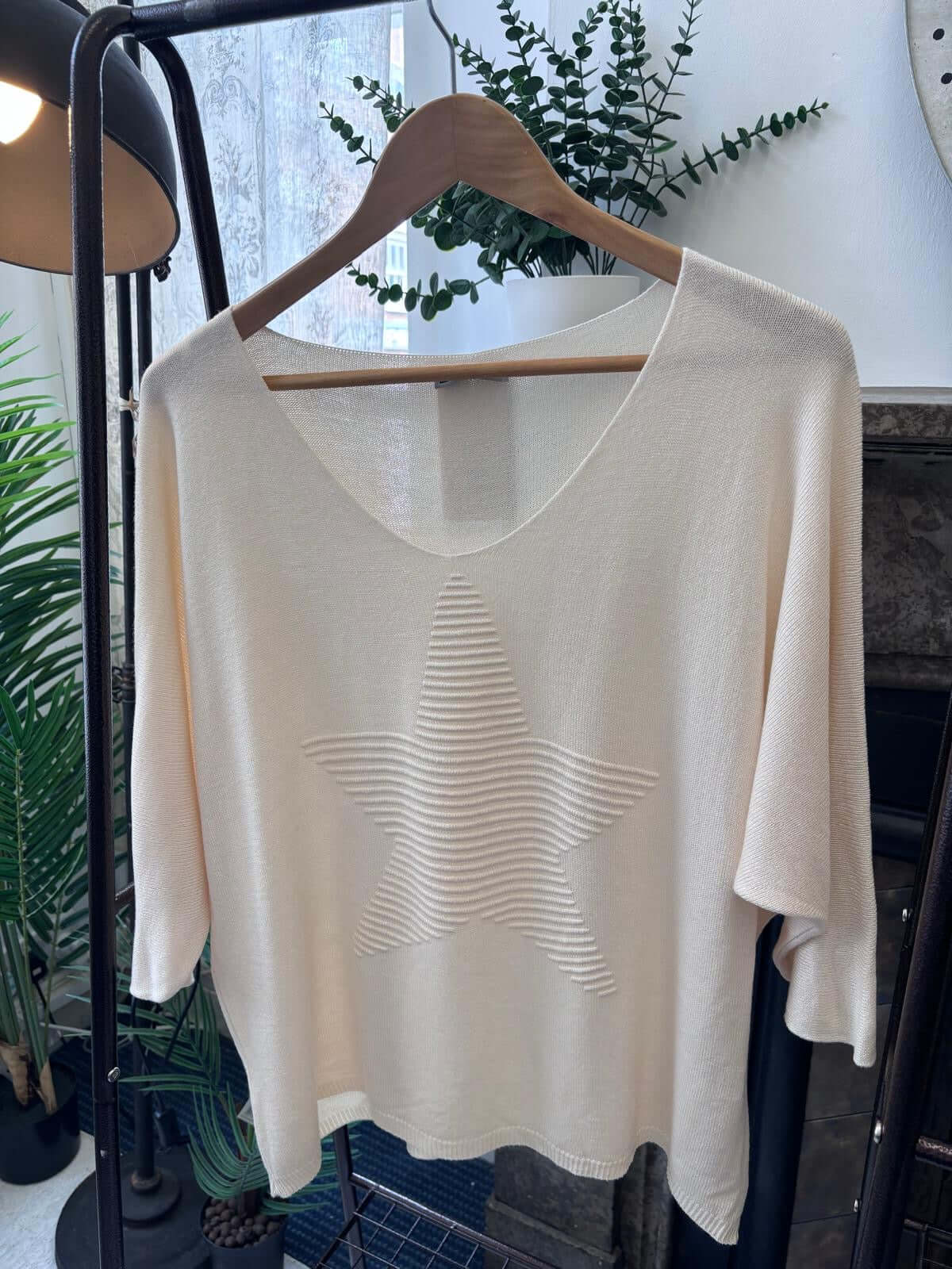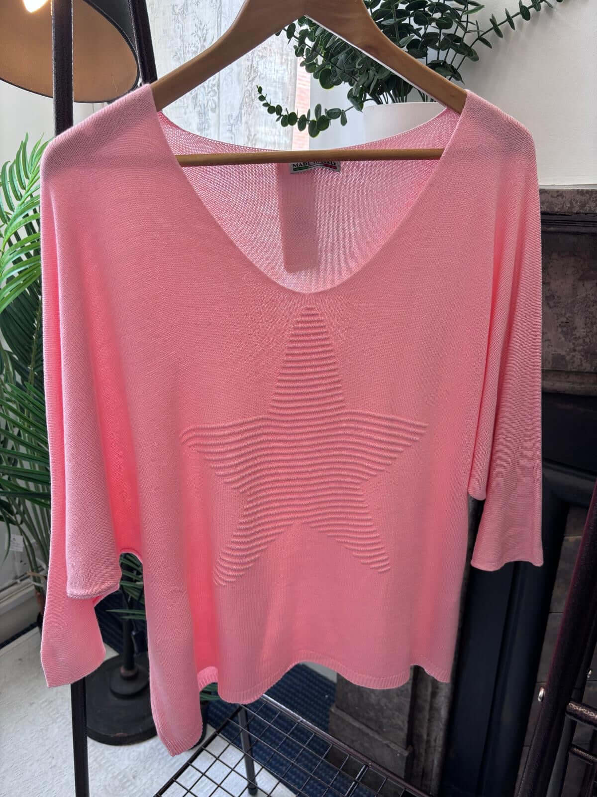 Introducing the Luna Ribbed Star Print Fine Knit Jumper. With gorgeous pastel colours and a slouchy shape, this jumper is perfect for those who want a playful yet stylish look. The v neck adds a touch of elegance, and the one size fits 10-14, making it a versatile addition to any wardrobe.